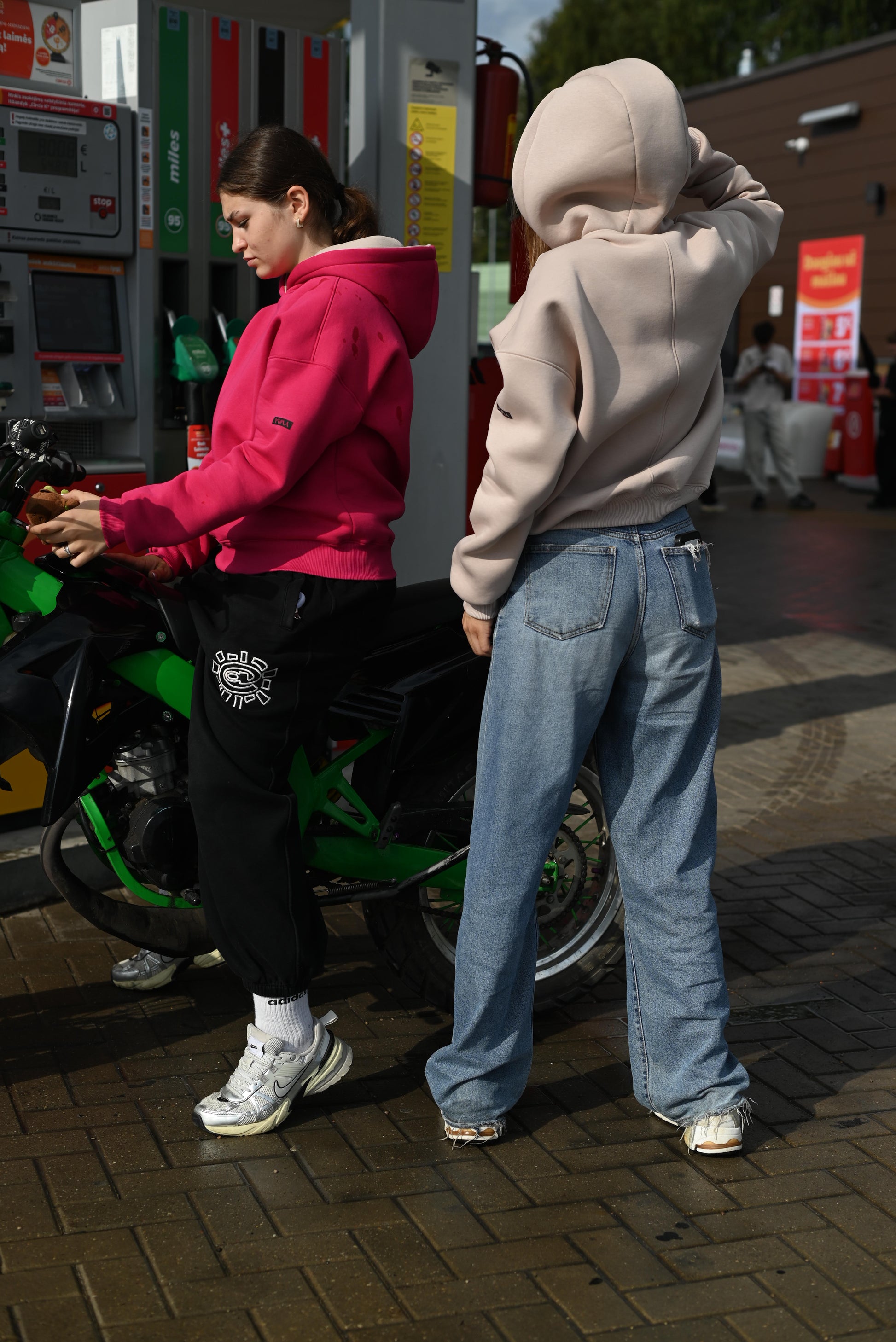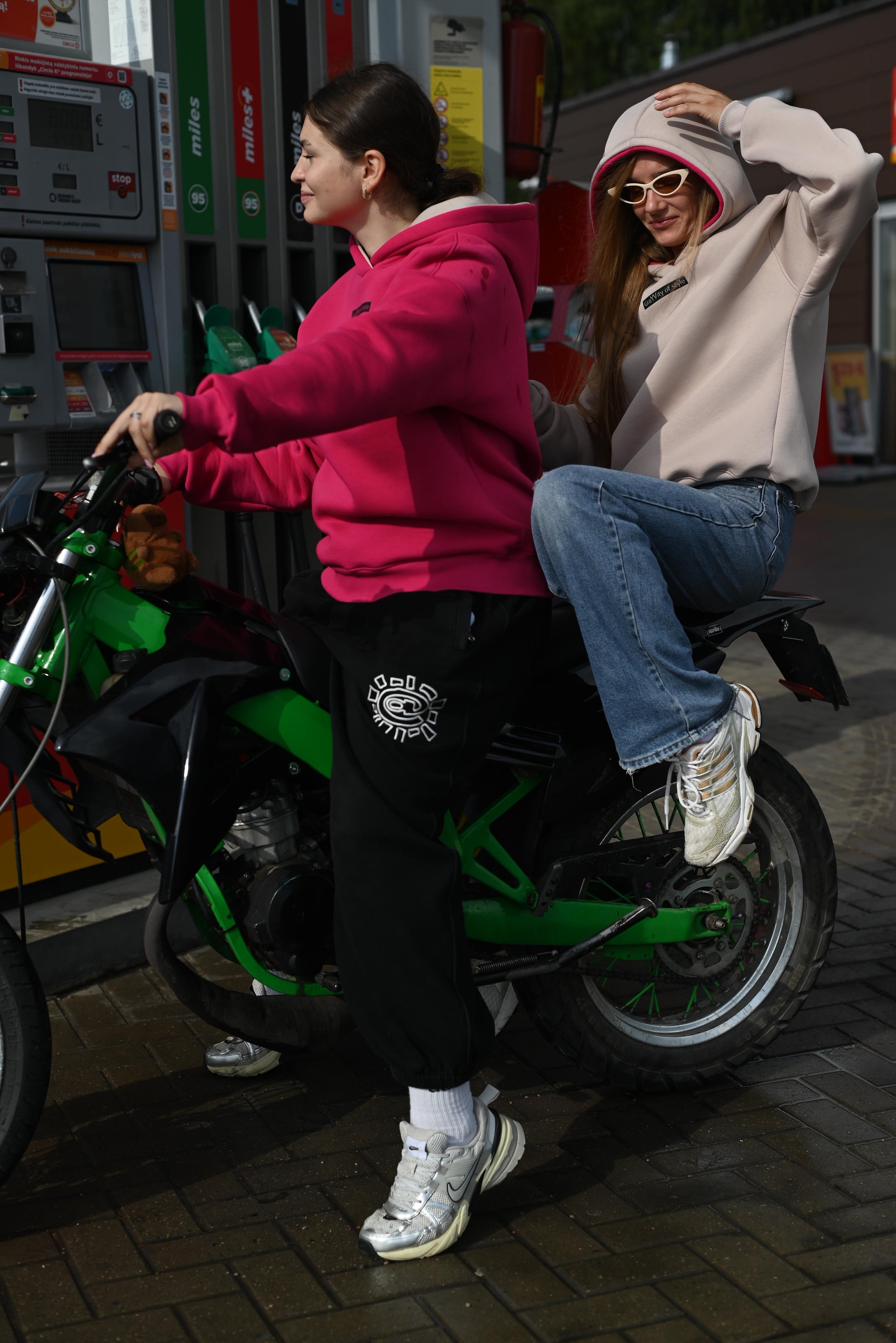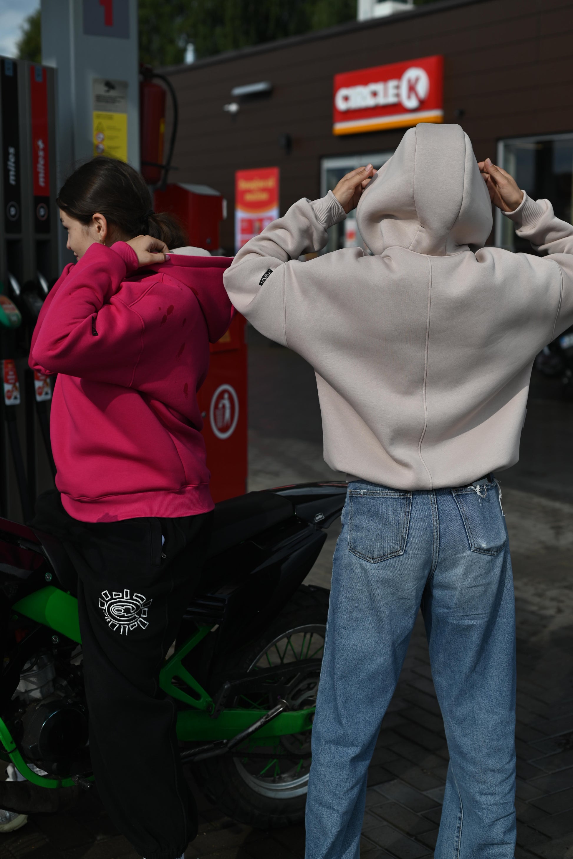 Soft, luxurious cashmere-colored hoodie with a vibrant, soft Raspberry hood inside. Sizes: MINI (XS, S), MIDI (M, L).