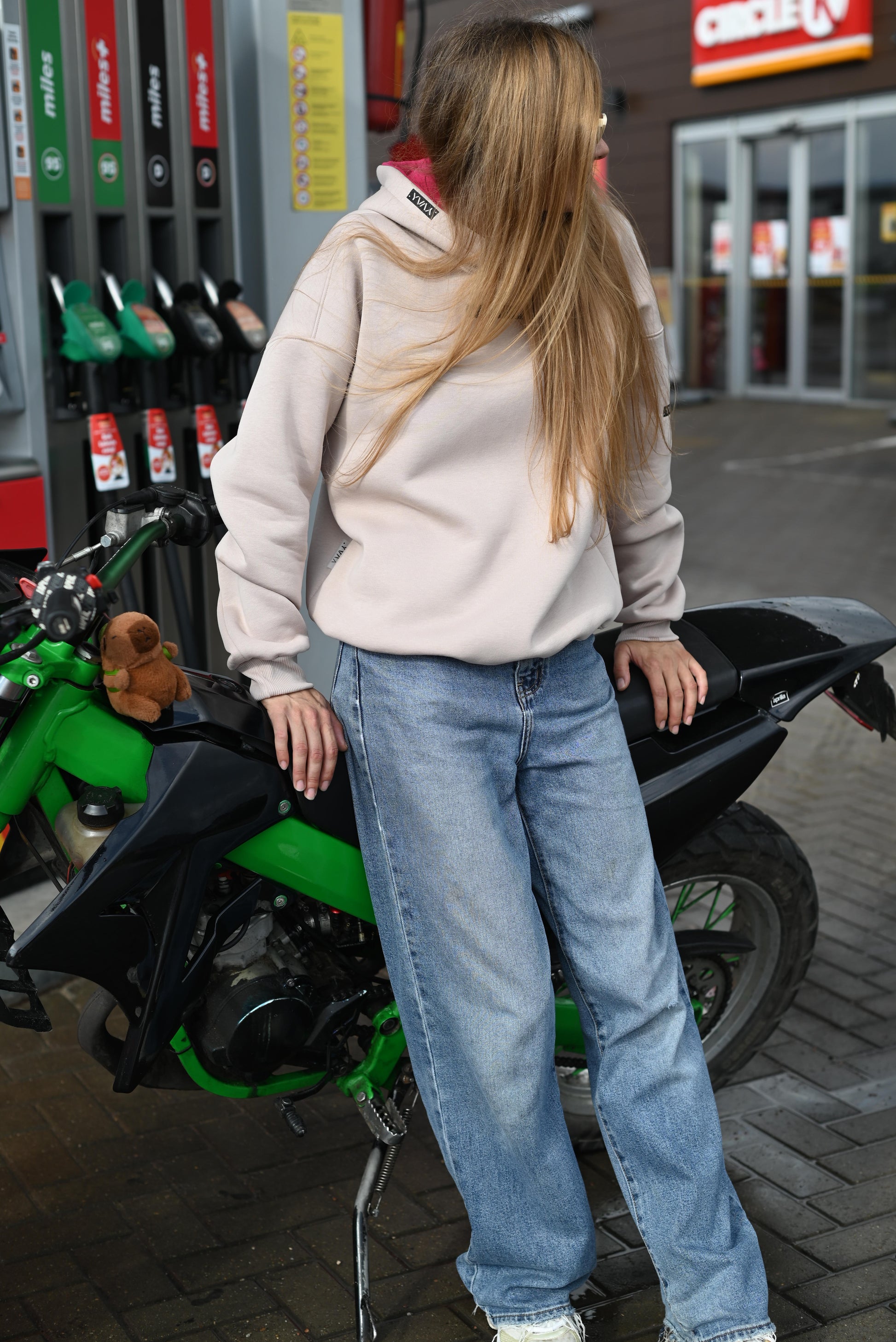 Minkštas, prabangus kašmyro spalvos džemperis su ryškiu, minkštu Raspberry kapišonu iš vidaus.