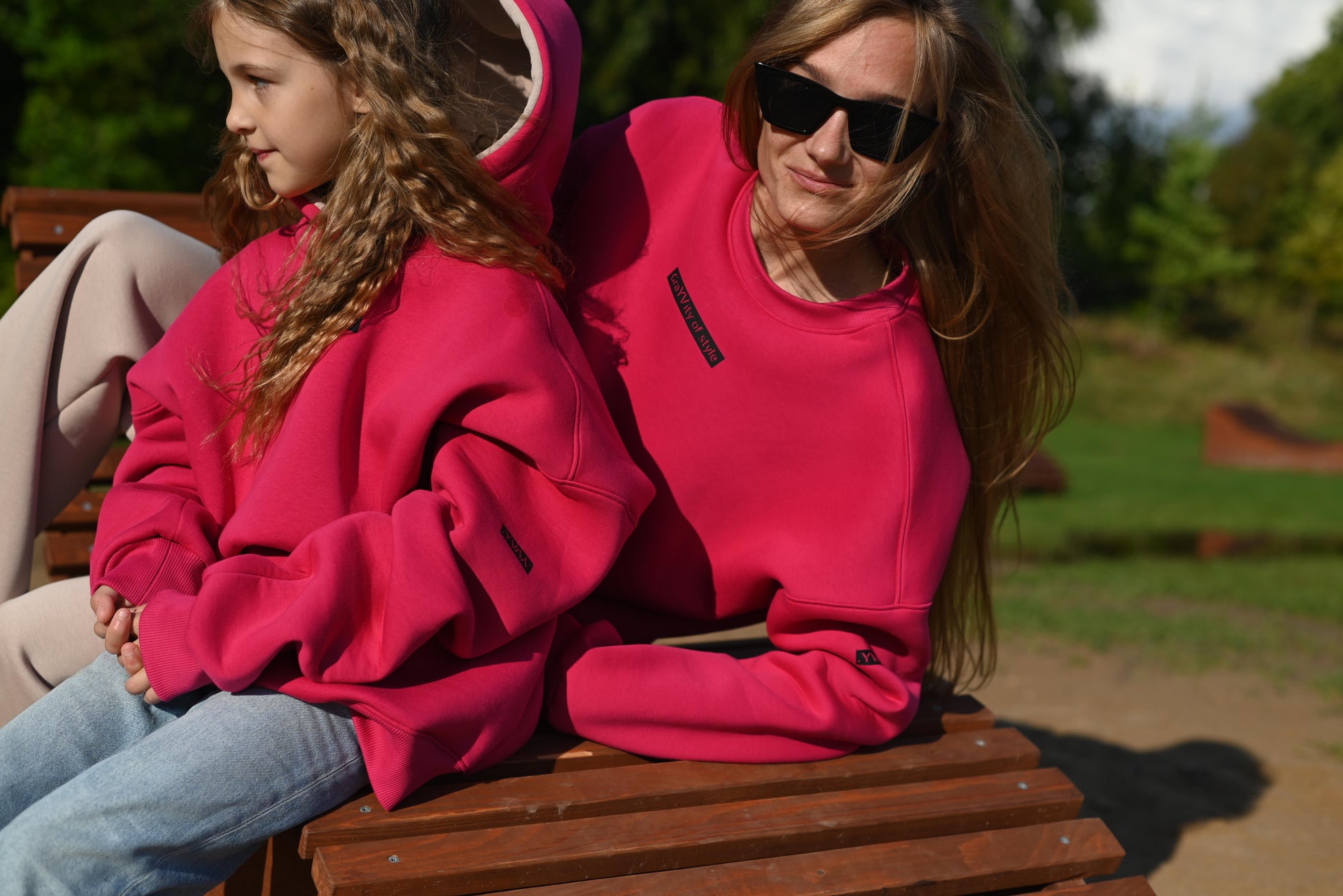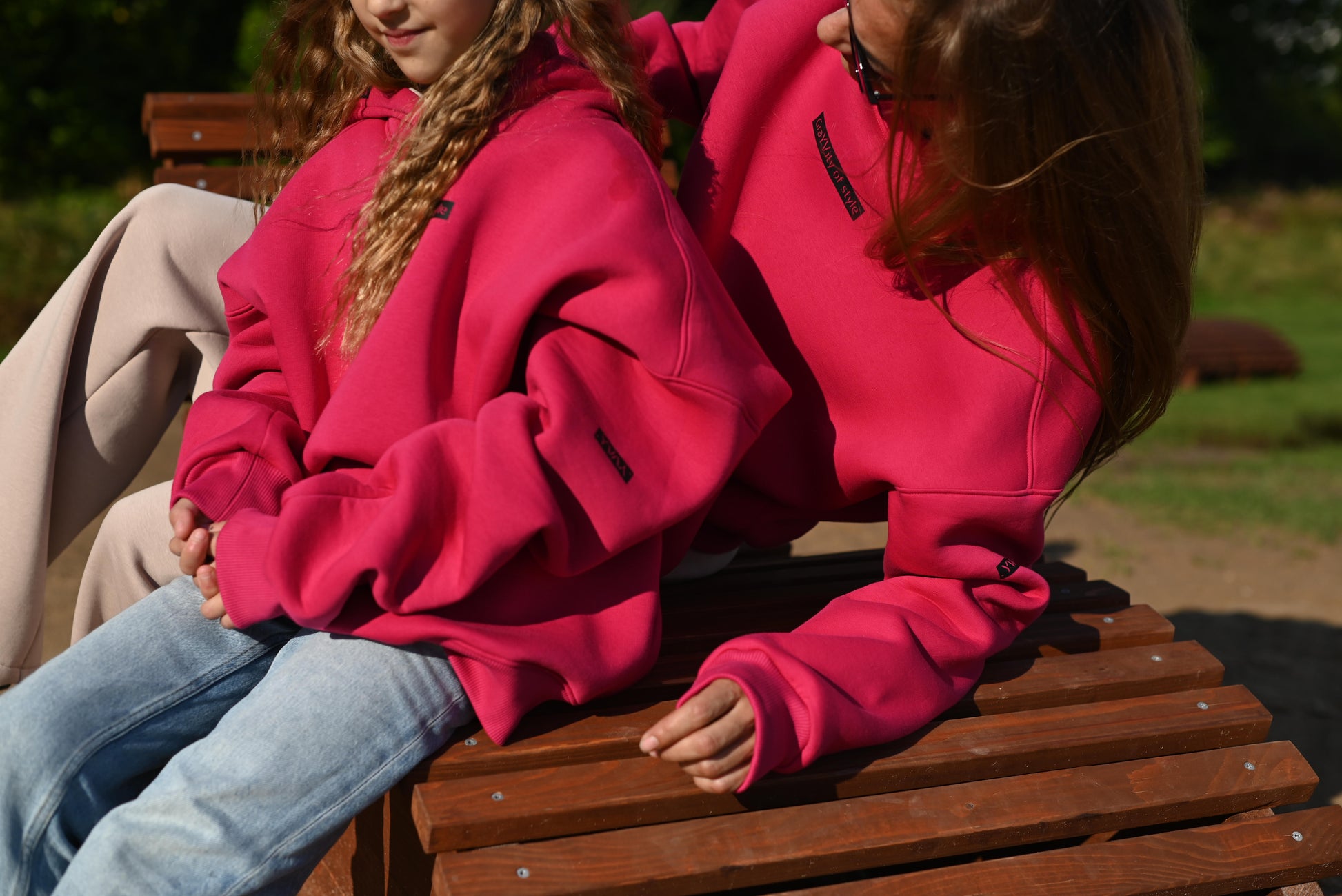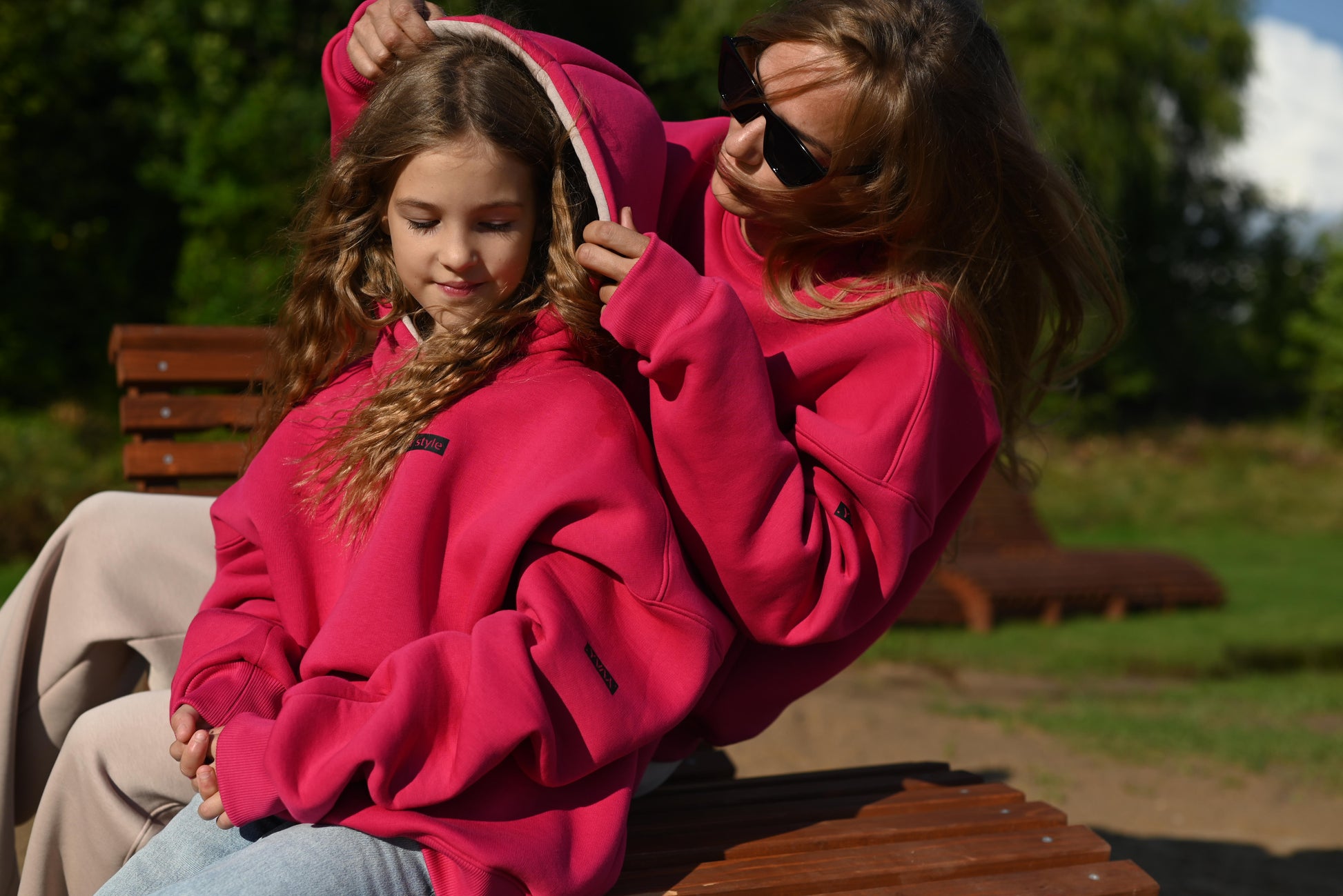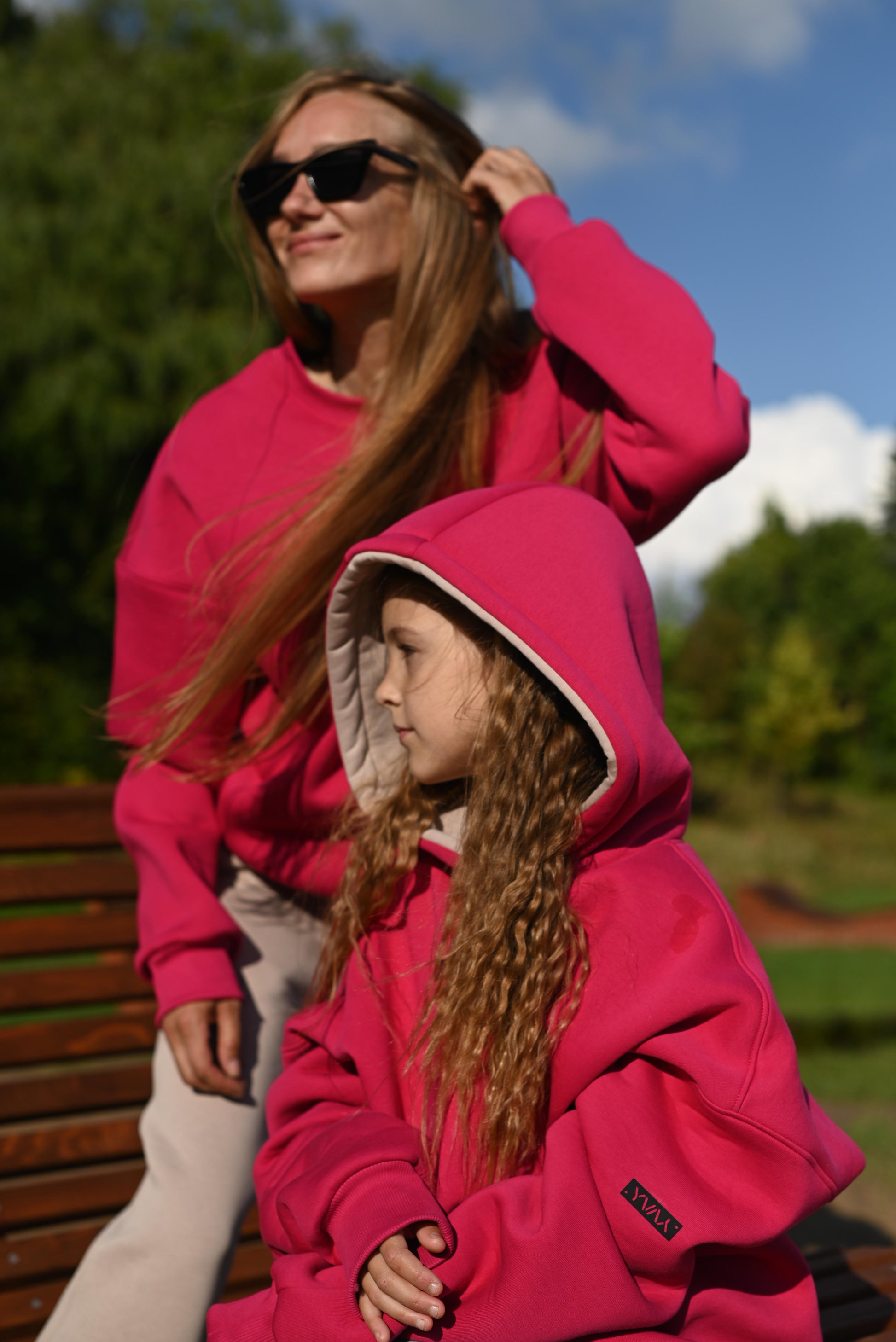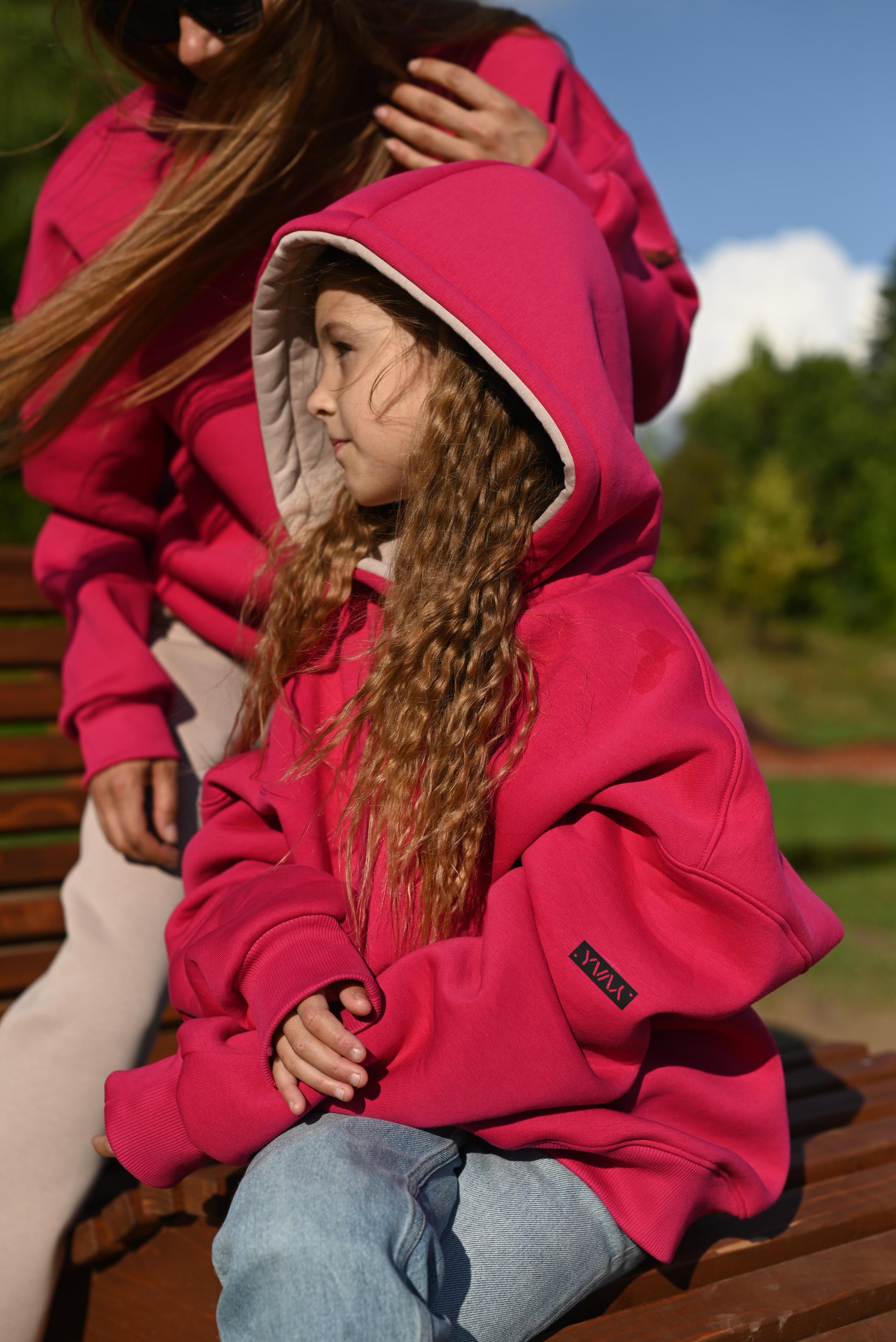 Soft, warm, and cozy Raspberry hoodie with a contrasting cashmere-colored hood inside. Sizes: MINI (XS, S), MIDI (M, L).