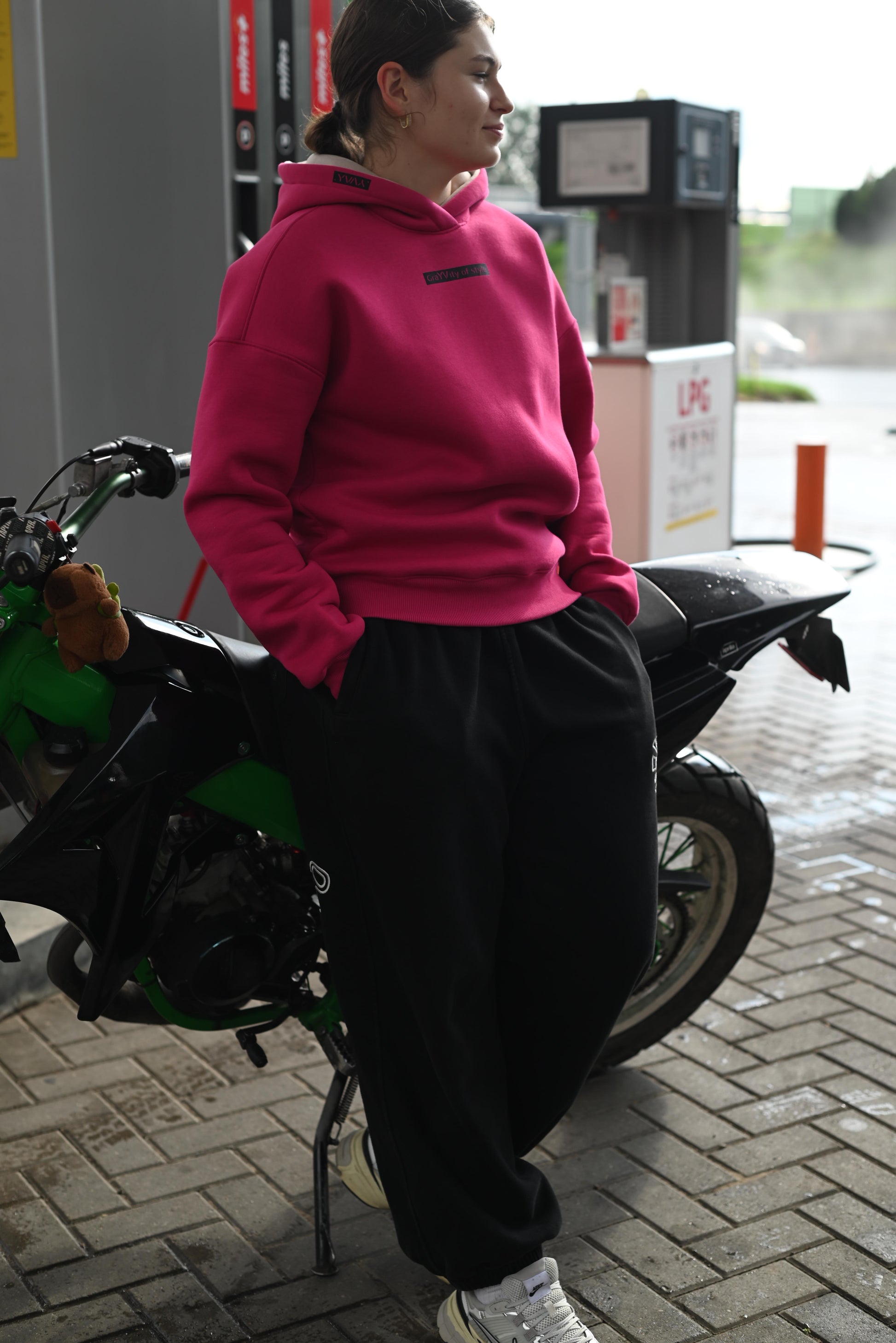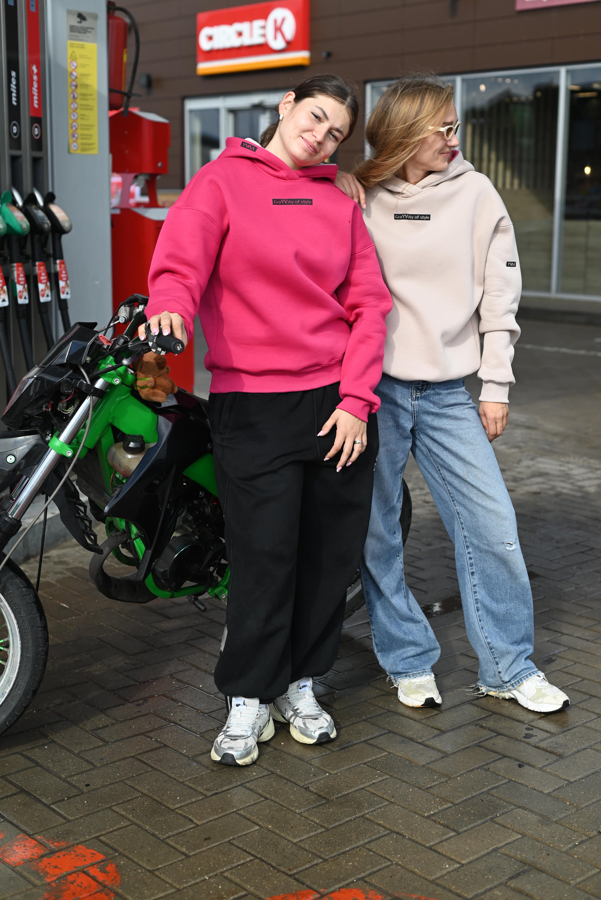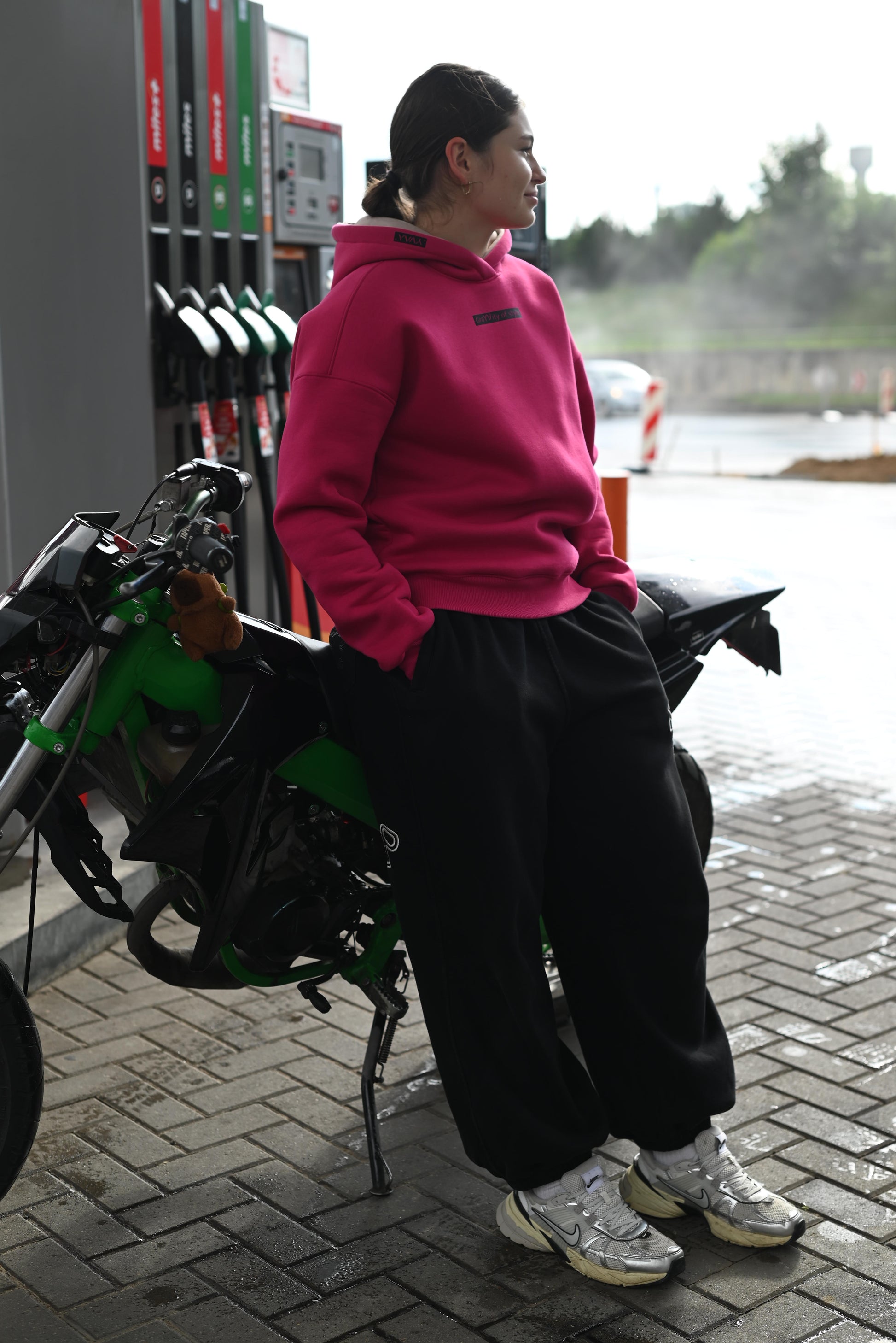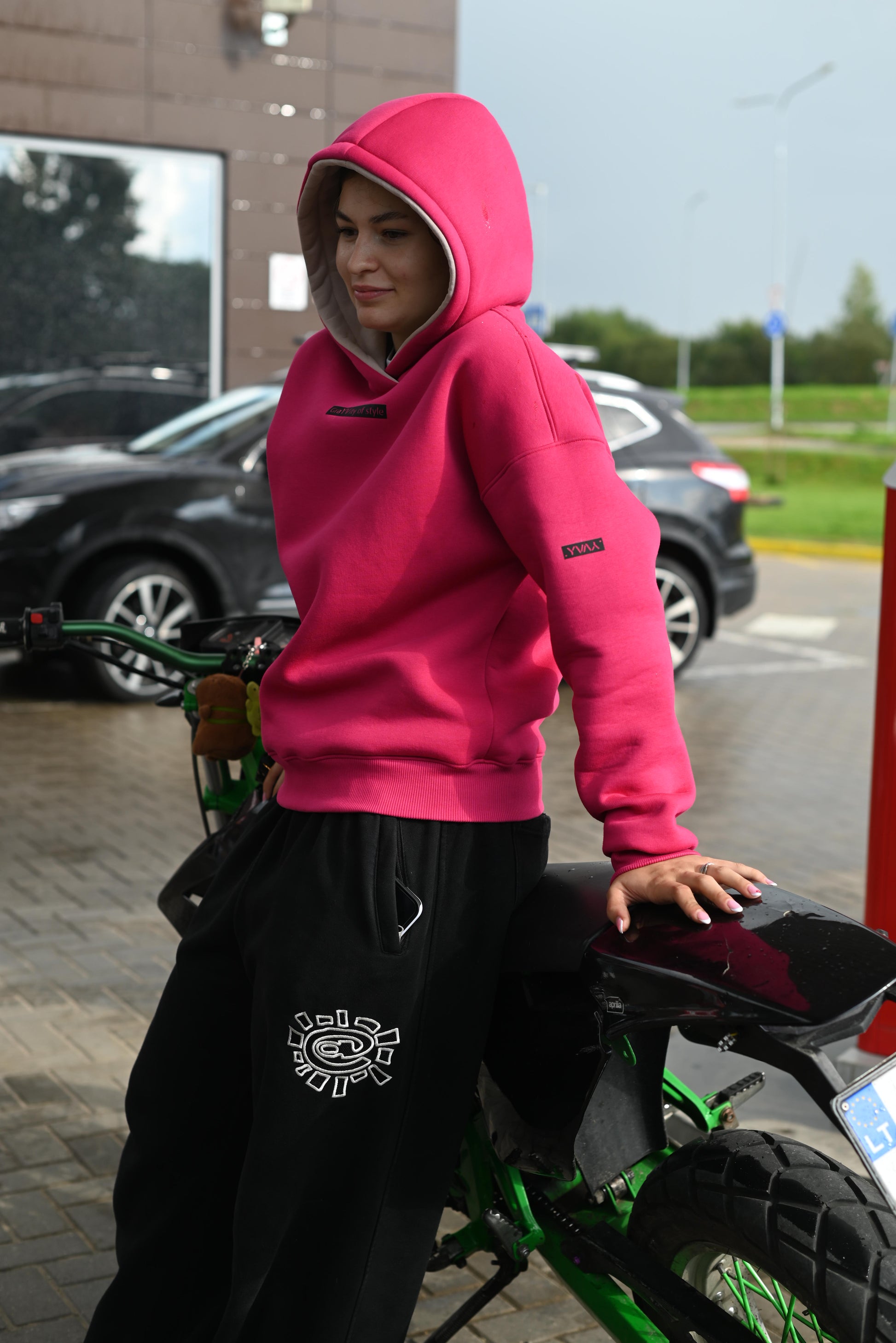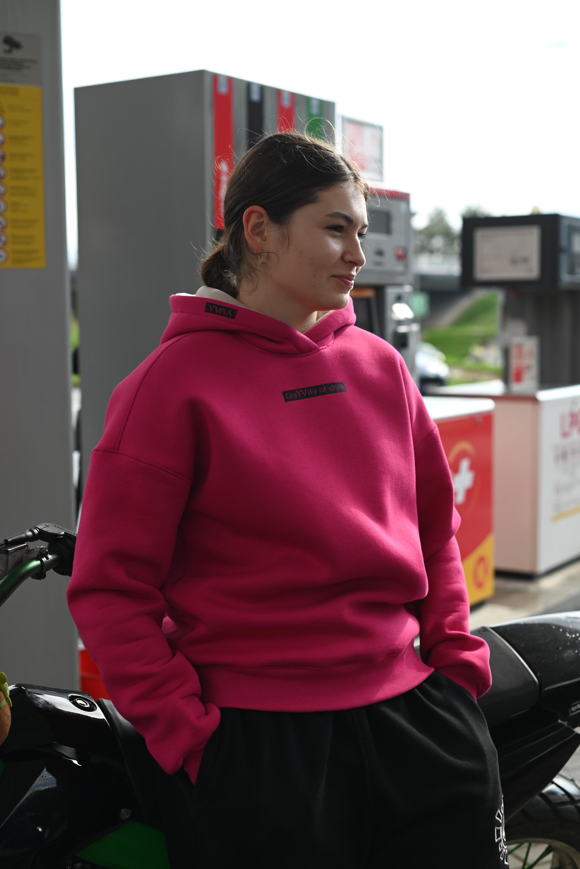 Soft, warm, and cozy Raspberry hoodie with a contrasting cashmere-colored hood inside. Sizes: MINI (XS, S), MIDI (M, L).